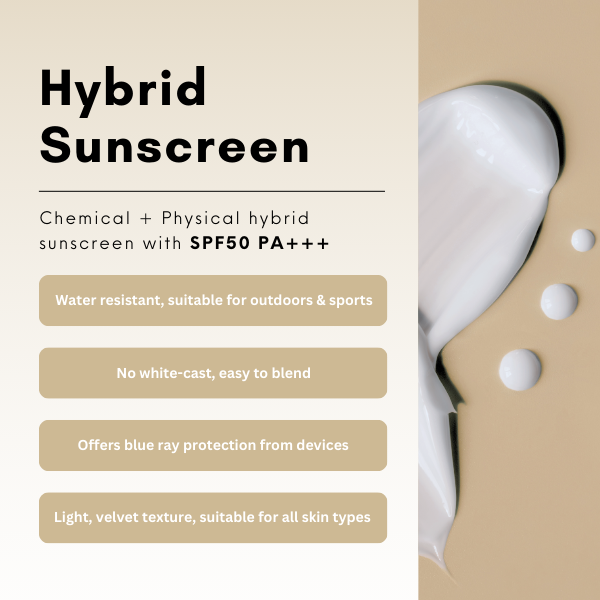 A water-resistant sunscreen suitable for Singapore's humid weather and for outdoor use. It shields you from both UV rays and Blue rays emitted from your smart devices. A hybrid sunscreen with properties of both chemical and mineral sunscreens to give you the best of both worlds - lightweight, easy to blend texture that is not irritating even on sensitive skin.